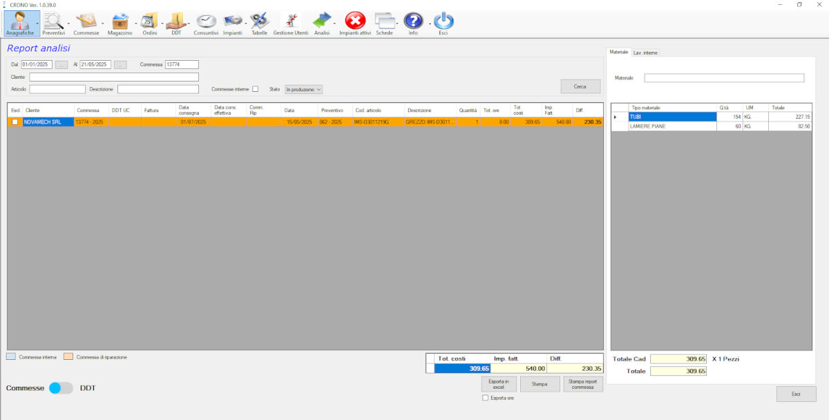 One of Crono’s key strengths is its ability to manage the complexity of custom, job-based work typical in the metal fabrication industry. The bill of materials was customized on Carpenteria Ilma request, resulting in a table organized by macro-categories such as sheet metal, bent parts, oxy-cut parts, tubes, flats, and more. This way, even non-standard variants are neatly grouped under the “miscellaneous” category.