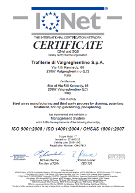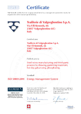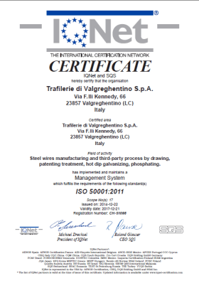 Trafilerie di Valgreghentino, manufacturing steel wire for industrial applications, is proud to announce the achievement of two important new certifications in December 2014: the OHSAS 18001, granting the use of a system aimed to protect safety and health of the workers, and the ISO 50001, concerning energetic efficiency.
