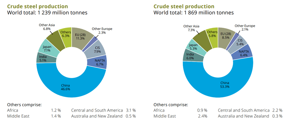 Delle 1.869 milioni di tonnellate di acciaio grezzo prodotte a livello globale, infatti, ben il 53,3% viene dalla Cina, mentre l’output dei paesi UE e NAFTA ammonta a 8,5% e 6,4% rispettivamente.