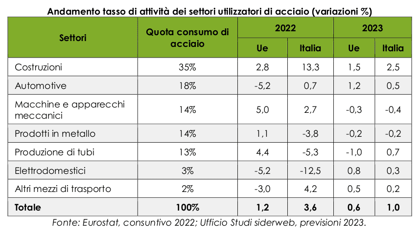 Nel complesso, l’attività dei settori utilizzatori è attesa in salita nel 2023 dell’1%. Dovrebbero arretrare leggermente macchine e apparecchi meccanici (-0,4% in Italia) e prodotti in metallo (-0,2%), mentre le costruzioni saliranno del 2,5%.